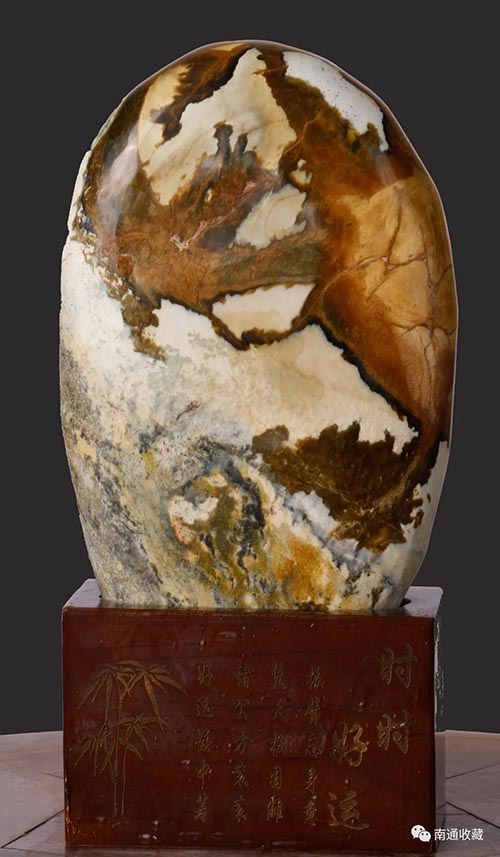 這塊奇石在蘭州所購,售石人姓牛,原來是當地建設局駕駛員,長年流連在黃河邊,他撿撿成了奇石收藏大家。他也愛寫詩,每一塊收藏的石頭都習慣賦詩一首。我去他家里看過,滿屋都是石頭。曾幾何時,我有一槍打收購他所有石頭的念頭,但考慮到后期沒地方陳設也就作罷了。生意沒做成,但是我與他成了朋友,常常微信互動。前些年,我去蘭州還約他吃了飯,這是收藏人之情。