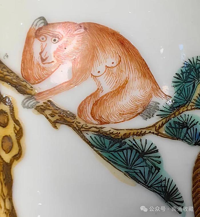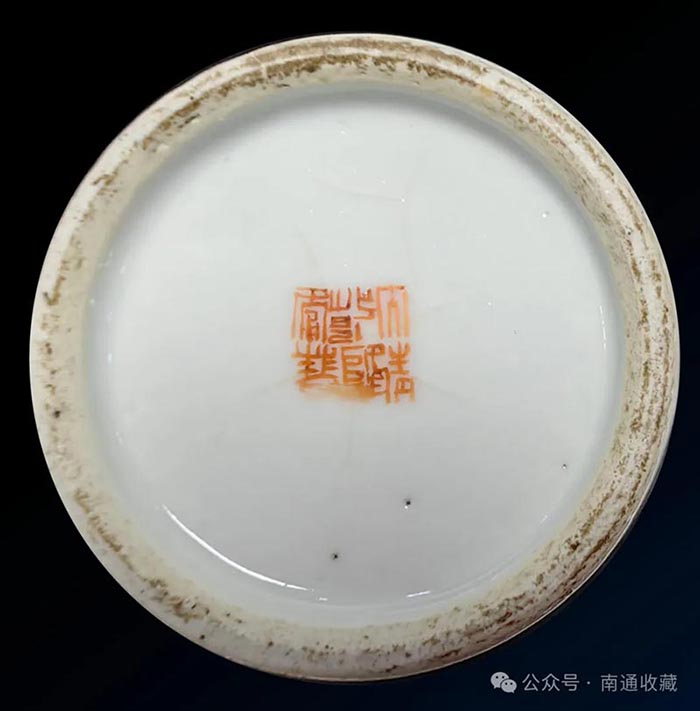 迷底就在于圈足中的三行六字,“大清乾隆年制”礬紅款,此尊為乾隆本朝出品,畫師很有經驗,不想給自己帶來麻煩,在繪畫時把兔子的尾巴加長。因為乾隆屬兔,該避忌的,還是要避忌,畫短了就會陷入“兔子尾巴長不了”之坑,惹上殺身之禍。